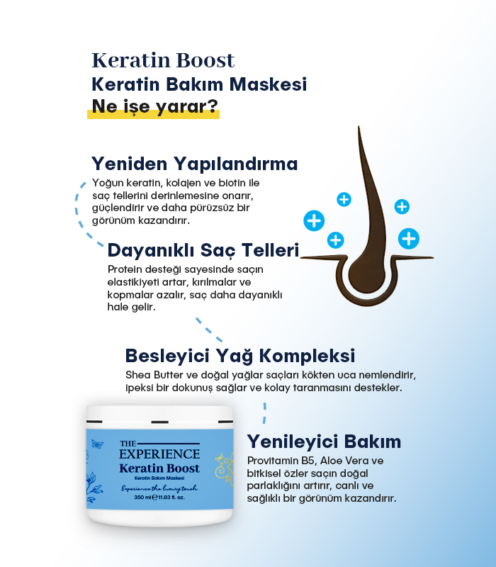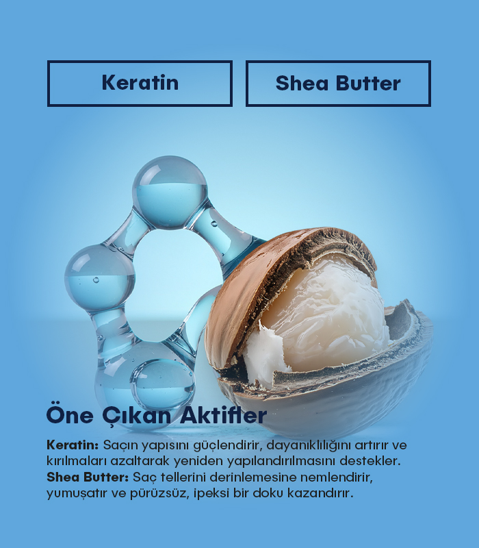 Yoğun Onarım ve Güçlendirme: İçeriğindeki Hidrolize Keratin, Kolajen ve Biotin ile saç tellerinin yapısını güçlendirir, kırılmaları azaltır ve saçın daha sağlıklı görünmesine katkı sağlar.