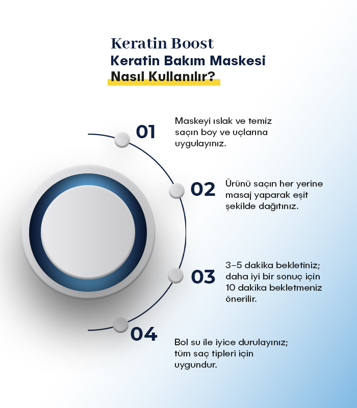 Islak ve temiz saça uygulanır. Saç boylarına ve uçlarına eşit şekilde dağıtılır. 3–5 dakika bekletildikten sonra bol su ile durulanır. (En iyi sonuç için 10 dakika bekletilmesi önerilir). Tüm saç tipleri için uygundur.