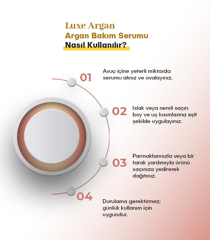 Argan Saç Bakım Serumu avuç içine ufak bir miktar alıp ovaladıktan sonra ıslak veya nemli saça eşit miktarda uygulanır, durulama gerektirmez.