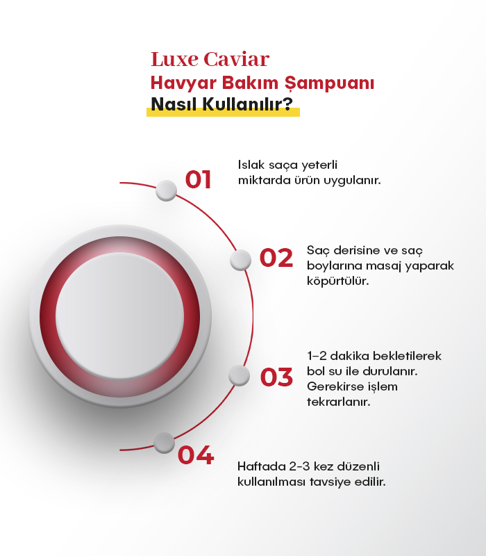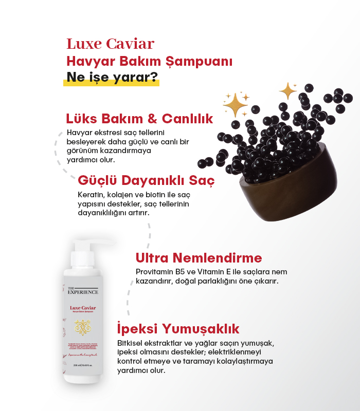 Havyar Ekstresi ile saç tellerine lüks bakım yapar, daha güçlü ve canlı görünmesine katkı sağlar. Keratin, Kolajen ve Biotin ile saç yapısını destekler, dayanıklılık kazandırır. Provitamin B5 ve Vitamin E (Tocopherol) saça nem ve parlaklık verir. Ginseng, Ginkgo Biloba, Yeşil Çay ve Isırgan Ekstreleri saç derisini canlandırmaya yardımcı olur. Shea, Argan ve Ceviz Yağları saçın daha yumuşak, ipeksi ve sağlıklı görünmesini destekler. Ayrıca saçların daha kolay taranmasına ve elektriklenmenin kontrolüne destek olur.
