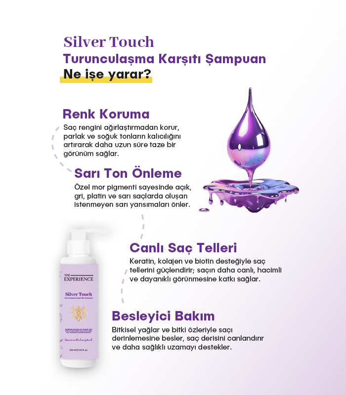Saç rengini ağırlaştırmadan korur, parlak ve soğuk tonların kalıcılığını artırır. İçeriğindeki özel mor pigment ile açık gri, platin ve sarı saçlardaki istenmeyen sarı yansımaları azaltmaya yardımcı olur. Hidrolize Keratin, Kolajen ve Biotin ile saç tellerini güçlendirir, canlılık ve hacim kazandırır. Argan, Shea, Hindistancevizi, Ayçiçeği, Fındık ve Ceviz yağları saça yoğun besleyici bakım yapar. Ginseng, Ginkgo Biloba ve Yeşil Çay Ekstreleri saç derisini canlandırır, sağlıklı uzamayı destekler. Kafein saç köklerini uyararak daha güçlü bir görünüm sağlar.